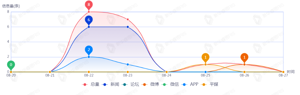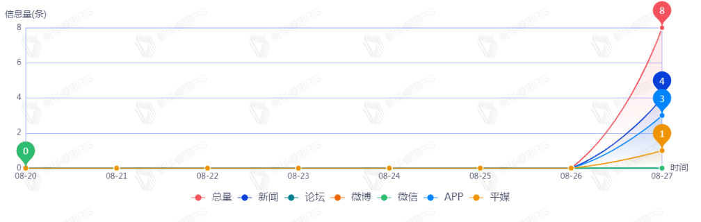 截至目前,该文章在互联网上传播总8篇,其中08-27是信息发布的高峰期,发布信息量为8。各信源的信息发布情况中,新闻信息占比最大,其次是APP和平媒,信息量分别为4、3、1,占比分别为50.00%、37.50%、12.50%。(数据来源:新华睿思系统)