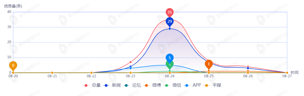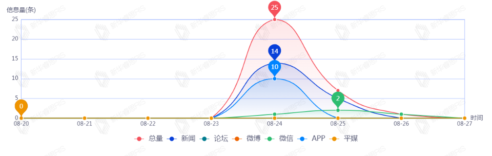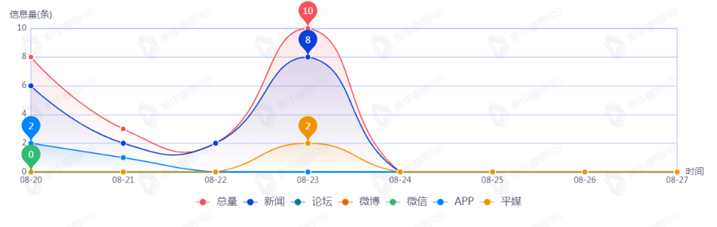 截至目前,该文章在互联网上传播总23篇,其中08-23是信息发布的高峰期,发布信息量为10。各信源的信息发布情况中,新闻信息占比最大,其次是APP和平媒,信息量分别为18、3、2,占比分别为78.26%、13.04%、8.70%。(数据来源:新华睿思系统)