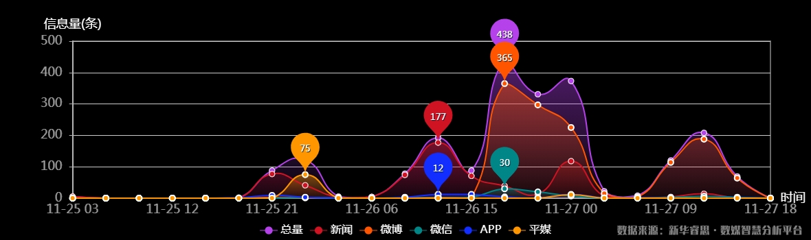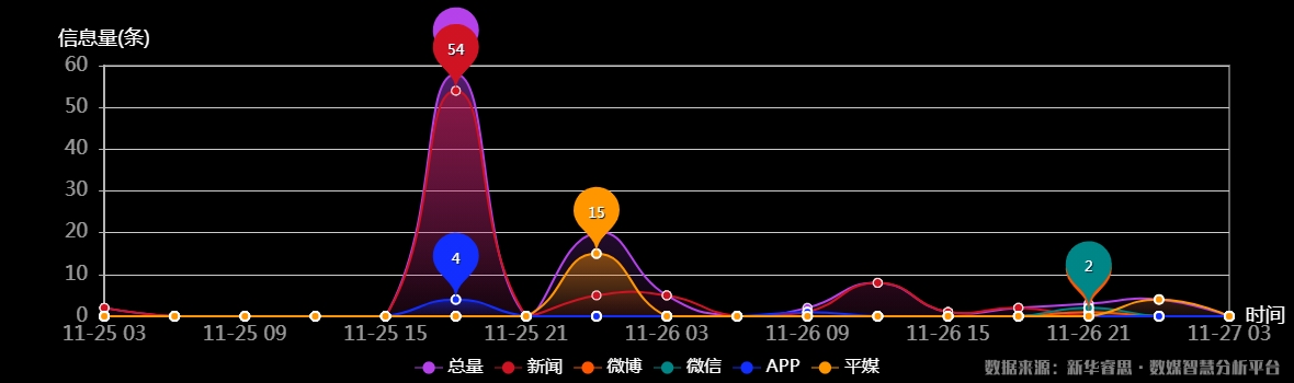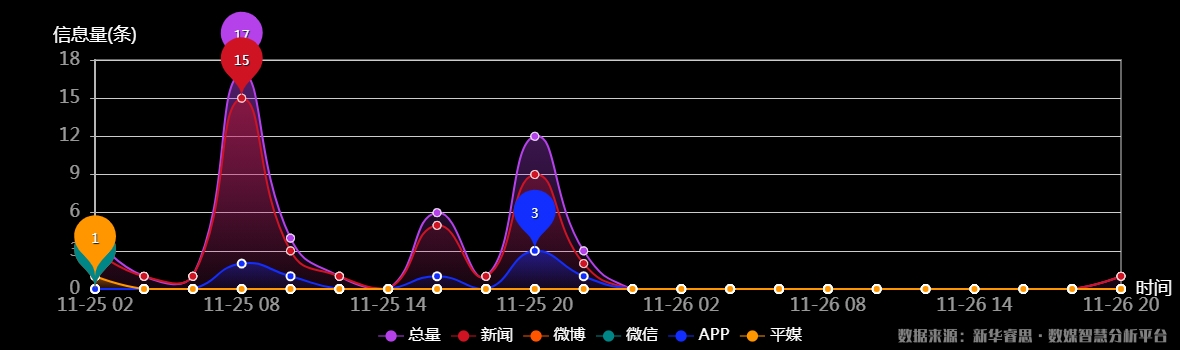 截至目前,该文章在互联网上传播时长为1天18小时1分钟,传播总量56篇,有37个媒体参与传播。 其中2020-11-25 07时是传播的高峰期, 共传播18篇文章。(数据来源:新华睿思•数媒智慧分析平台)
