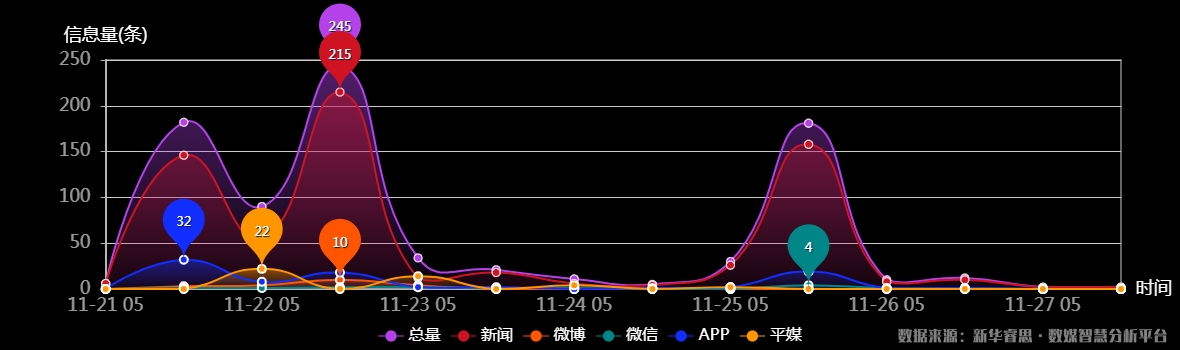 截至目前,该文章在互联网上传播时长为6天15小时40分钟,传播总量875篇,有469个媒体参与传播。 其中2020-11-21 14时是传播的高峰期, 共传播90篇文章。(数据来源:新华睿思•数媒智慧分析平台)