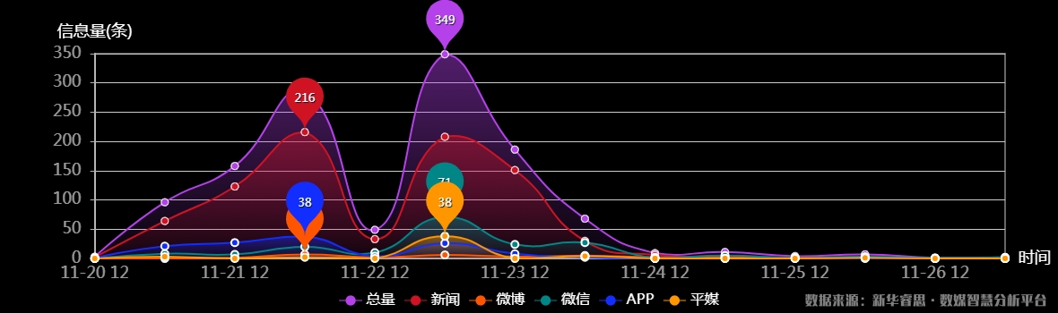 截至目前,该文章在互联网上传播时长为6天16小时47分钟,传播总量1328篇,有569个媒体参与传播。 其中2020-11-21 15时是传播的高峰期, 共传播85篇文章。(数据来源:新华睿思•数媒智慧分析平台)