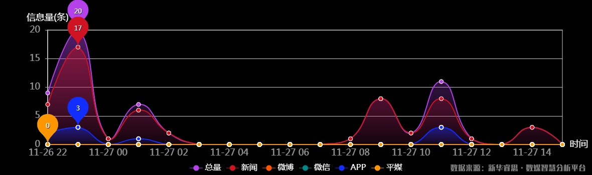 截至目前,该文章在互联网上传播时长为15小时21分钟,传播总量73篇,有43个媒体参与传播。 其中2020-11-26 22时是传播的高峰期, 共传播20篇文章。(数据来源:新华睿思•数媒智慧分析平台)