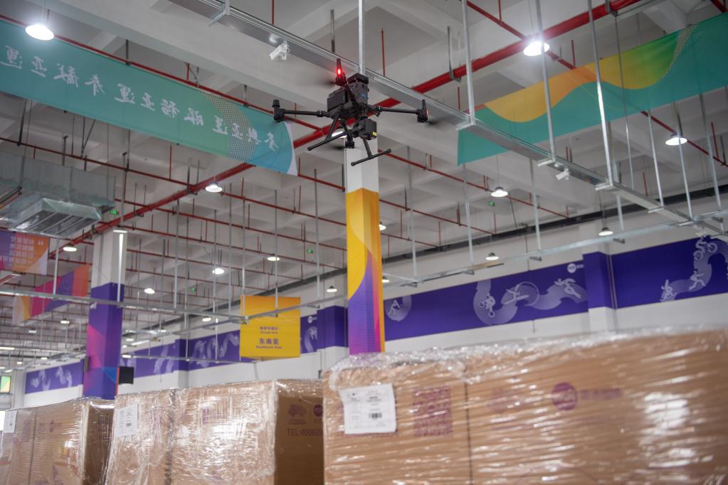 6月21日,工作人员使用无人机对杭州亚运会物流中心内的包裹进行清点。新华社记者江汉摄
