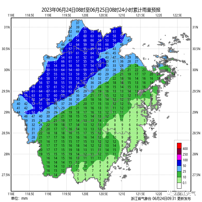 24日梅雨带仍在浙江北部地区,浙北和浙中西部有中到大雨,杭州、湖州、嘉兴、衢州北部、金华西北部、绍兴西北部等地部分有暴雨,上述地区累计雨量(24日11时至25日11时)30~60 毫米,局地80毫米以上。