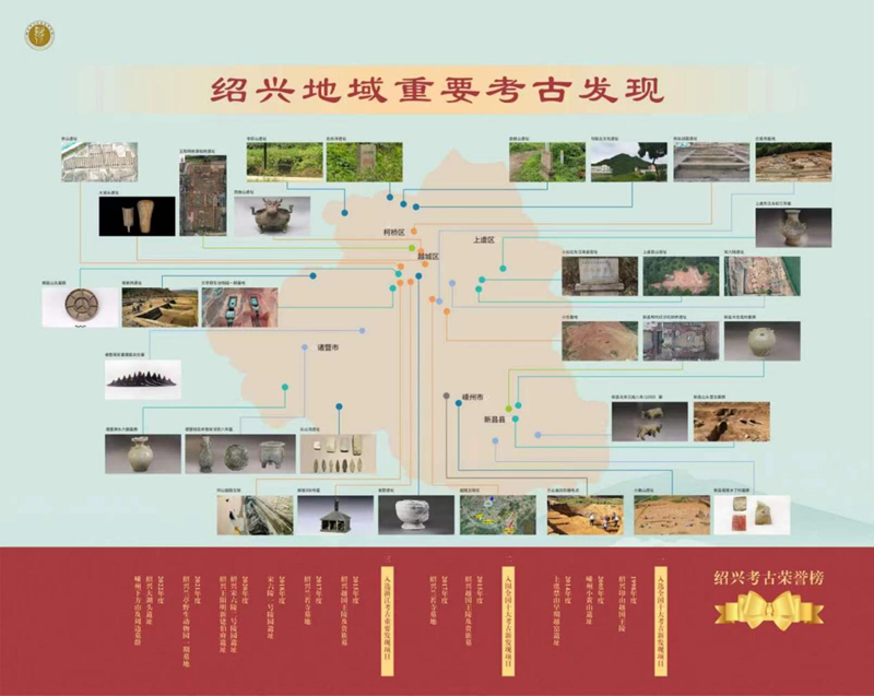 绍兴是我国首批历史文化名城,据不完全统计,1949年以来,绍兴考古项目约300余项。其中,绍兴印山越国王陵、嵊州小黄山遗址、上虞禁山早期越窑遗址、绍兴越国王陵及贵族墓、绍兴兰若寺墓地先后入选或入围“全国十大考古新发现”。绍兴越国王陵及贵族墓、绍兴兰若寺墓地、绍兴宋六陵一号陵园遗址、绍兴宋六陵二号陵园遗址、绍兴王阳明新建伯府遗址、绍兴兰亭野生动物园一期墓地、绍兴大湖头遗址、嵊州下方山及周边墓群等入选“浙江考古重要发现”。