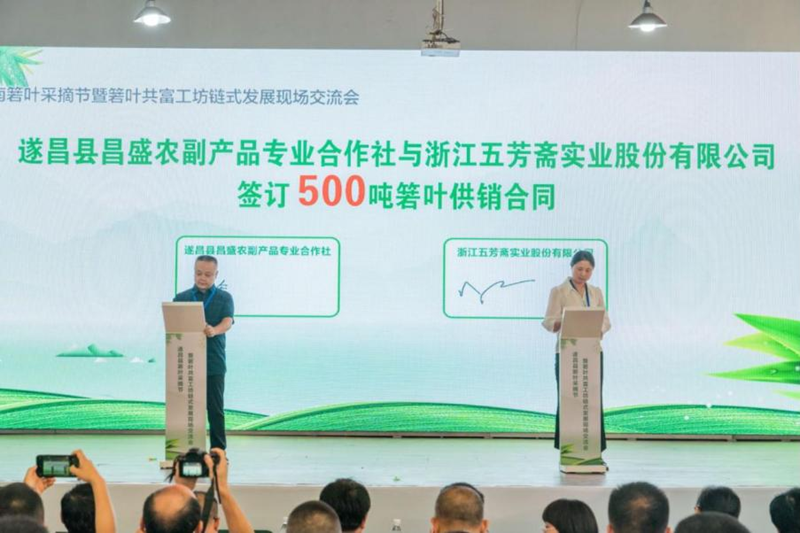当天的现场交流会上,丽水市箬叶产业党建联建正式启动,并签订丽水市箬叶产业联盟盟约,汇聚全市箬叶产业发展合力;遂昌县多个专业合作社分别与浙江五芳斋实业股份有限公司、嘉兴建箬园贸易有限公司签订500吨箬叶供销合同,垵口乡小岩村与嘉兴南湖斋食品有限公司签订党建联建协议;为助力箬叶产业发展,稠州银行向遂昌县箬叶产业协会授信8000万元。
