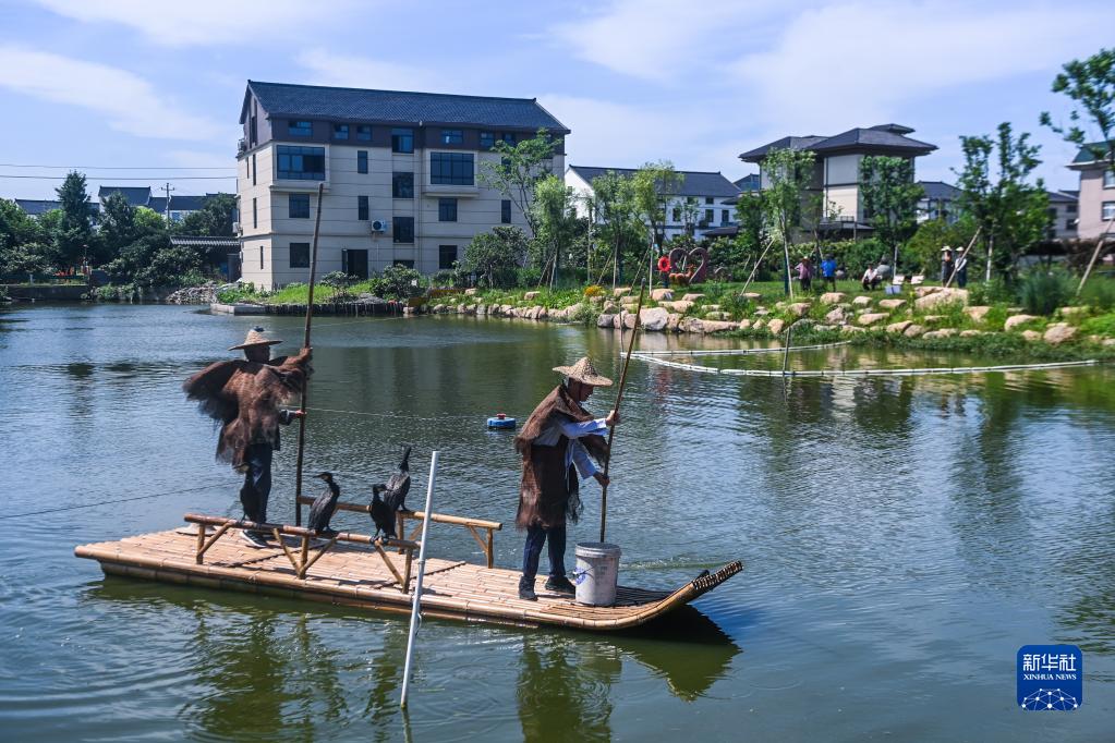 6月28日,在塘栖镇丁河村共富工坊旁的河塘里,村民和游客们在观看鸬鹚捕鱼表演。