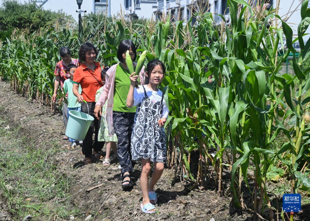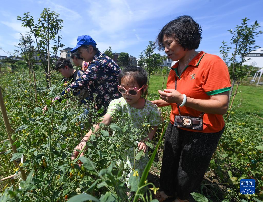 6月28日,在塘栖镇丁河村的共富工坊农业果园内,小朋友体验采摘。