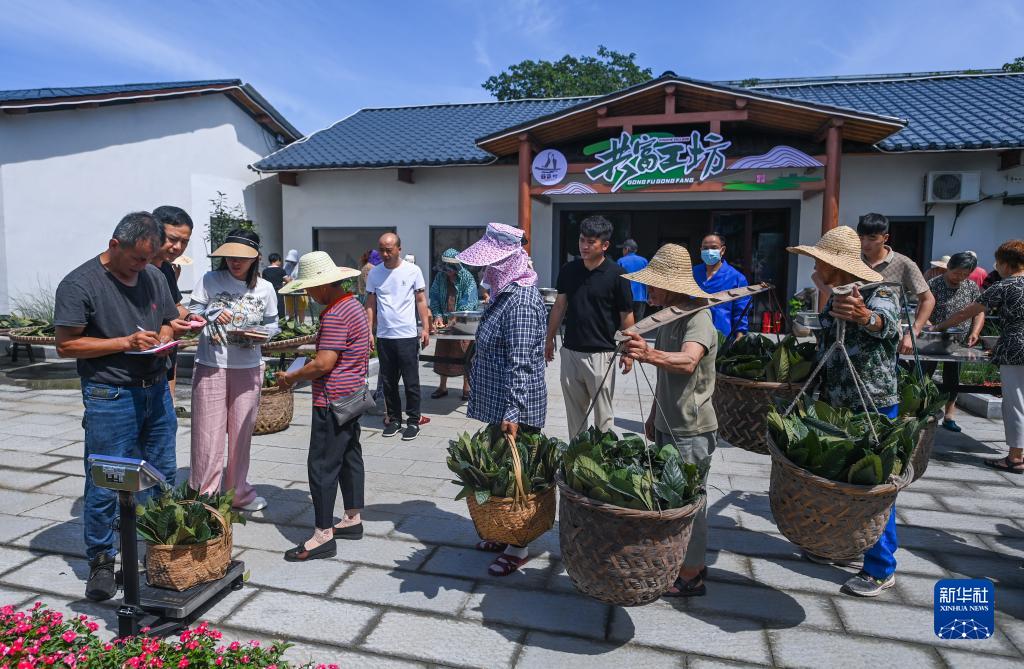 6月28日,塘栖镇丁河村共富工坊的工作人员在收购周边村民采摘下来的枇杷叶,用于生产特色的枇杷叶茶。前期丁河村邀请相关专家进行枇杷叶茶的研发,并于今年4月正式投产,共富工坊目前每月收购来自周边枇杷果农的数千斤枇杷叶用于制作枇杷叶茶。