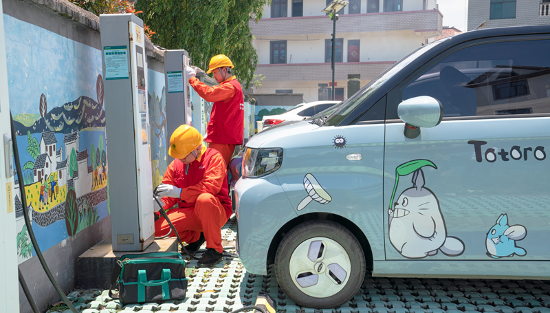 国网衢州供电公司工作人员在余东村停车场对充电桩进行安全隐患排查。吴文涛 摄