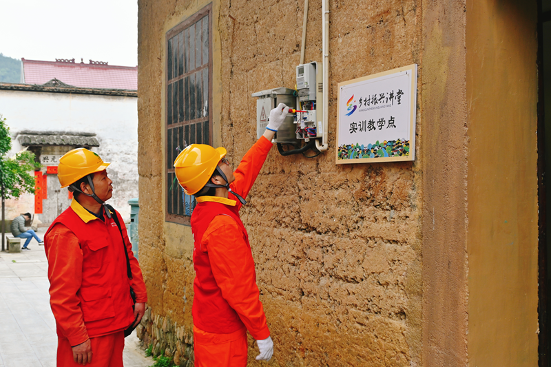 国网衢州供电公司工作人员在余东村乡村振兴讲堂开展安全用电检查。(钱琛怡 摄)