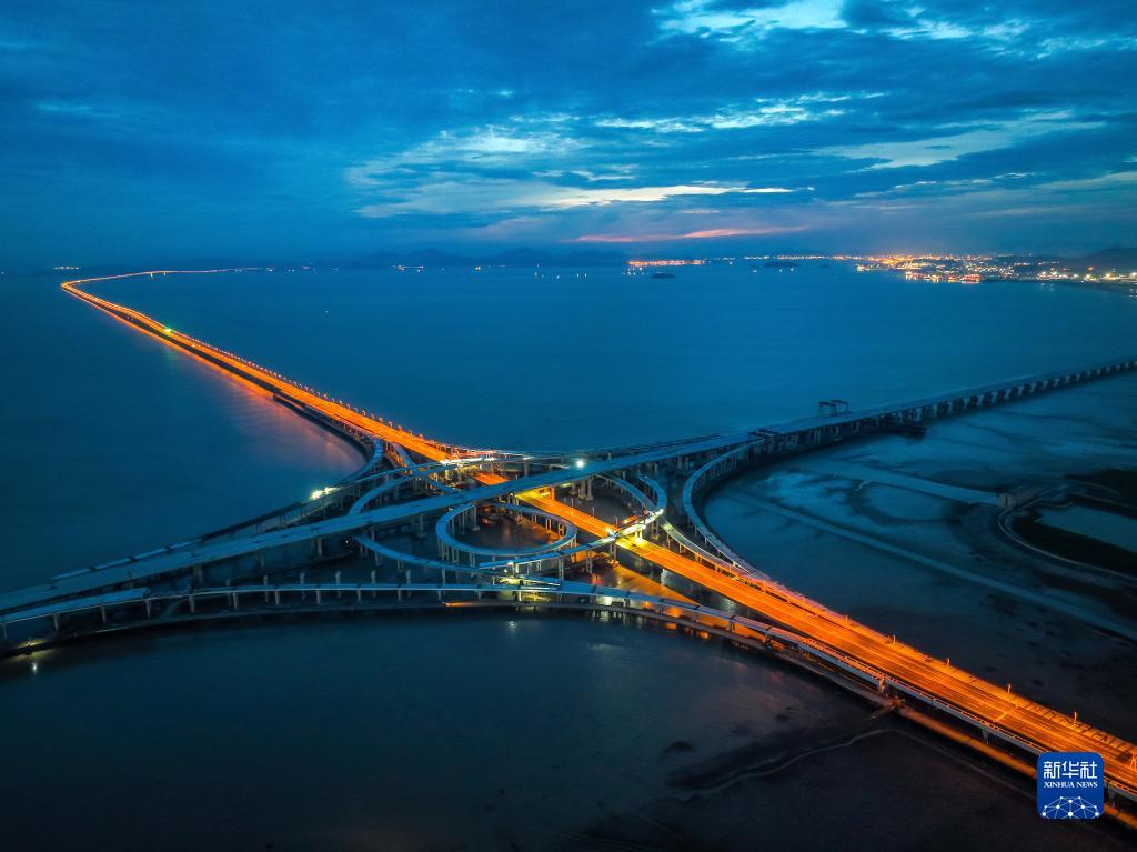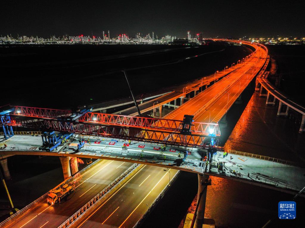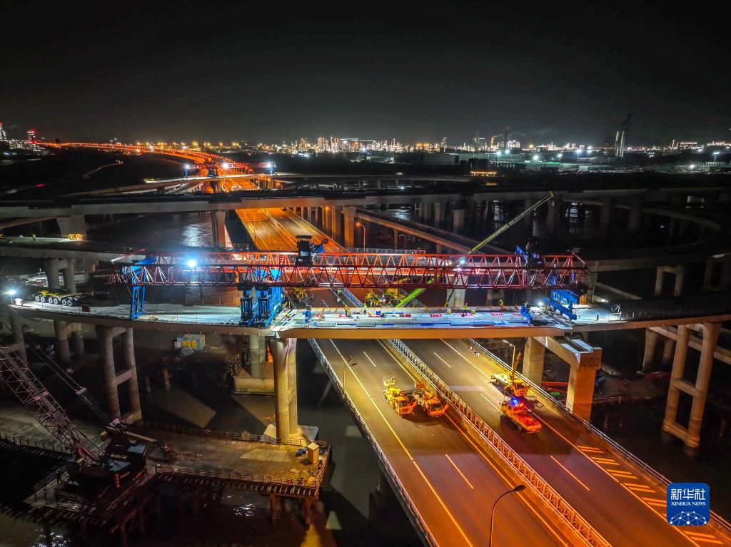 当日,在杭甬复线宁波一期滨海互通施工现场,滨海互通继主线和F匝道两次上跨之后,第三次成功跨越金塘大桥,为实现年底建成目标迈出重要一步。新华社发(姚峰摄)