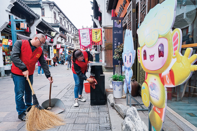 浙江建德市梅城镇古街,社区党员干部、志愿者打扫古镇卫生(2023年4月24日摄)徐昱 摄