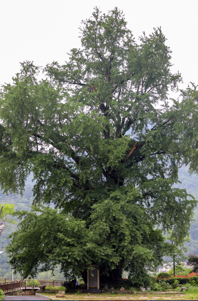 生长在杭州市临安区清凉峰镇白果村卫生院旁的千年银杏仍然长势茂盛(2023年6月28日摄)。(曹筠修 摄)
