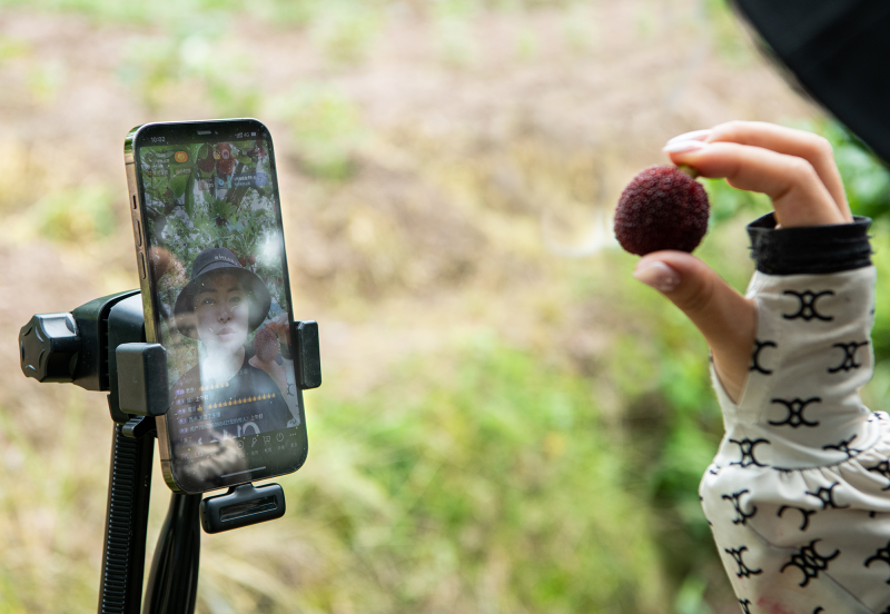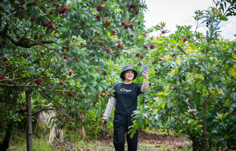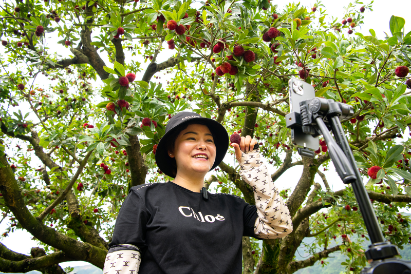 在当地南田镇梅树村杨梅采摘园,杨梅挂满了枝头。文成本土民食库主播赵燕燕主播正手持手机和农户一起,穿梭在杨梅树林中,一边讲解杨梅的品种、生长环境和营养价值,一边品尝向观众推荐。