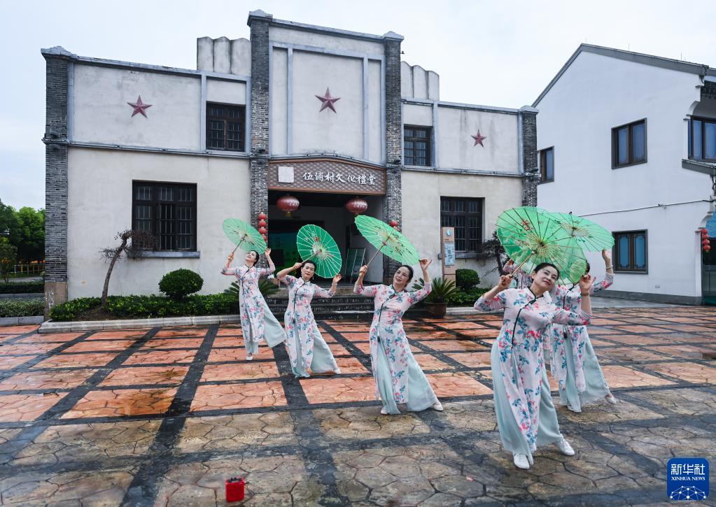 7月5日,老年舞蹈队在织里镇伍浦村文化礼堂前排练。