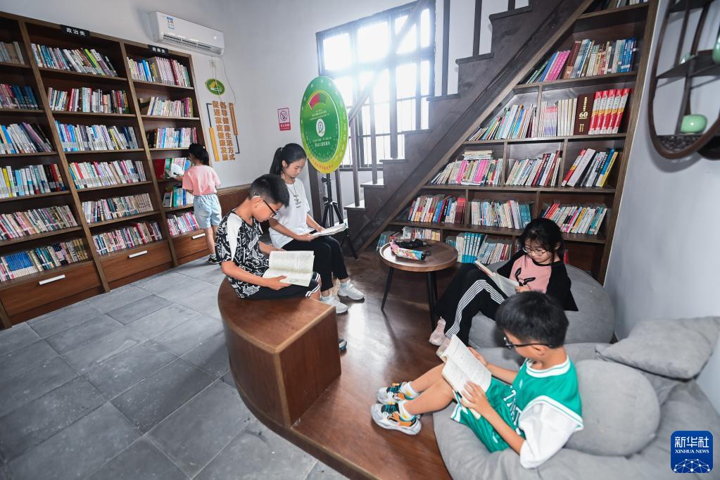 7月5日,孩子们在织里镇伍浦村文化礼堂内的图书室看书。