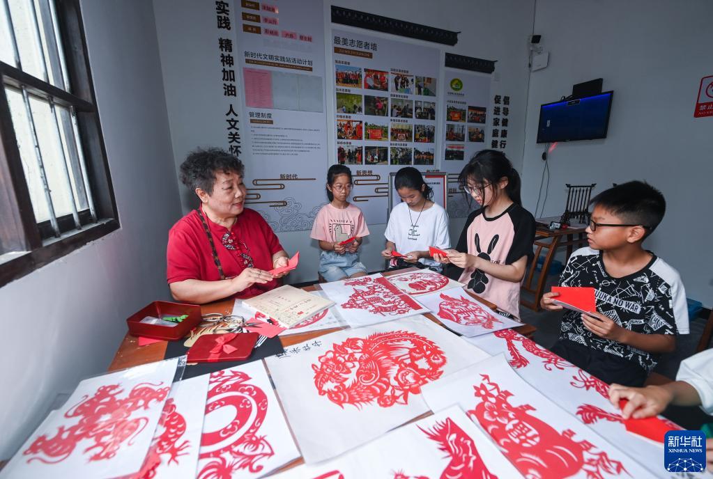 7月5日,剪纸老师在伍浦村文化礼堂内的暑期公益课堂教孩子们剪纸技艺。