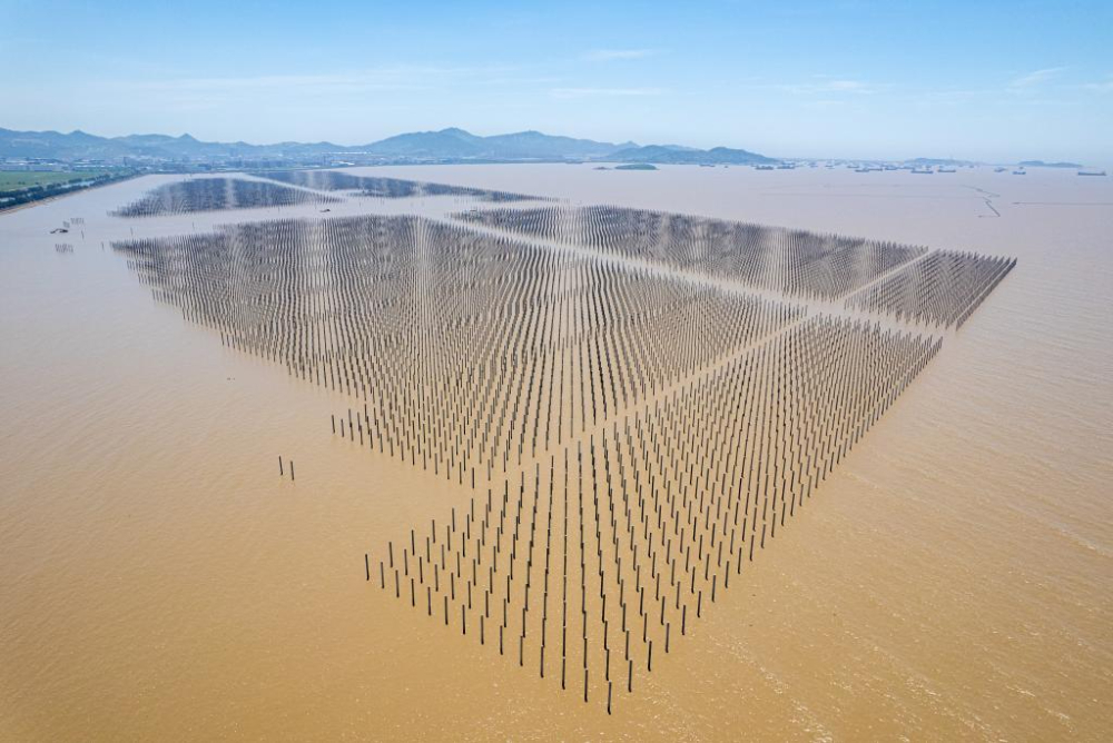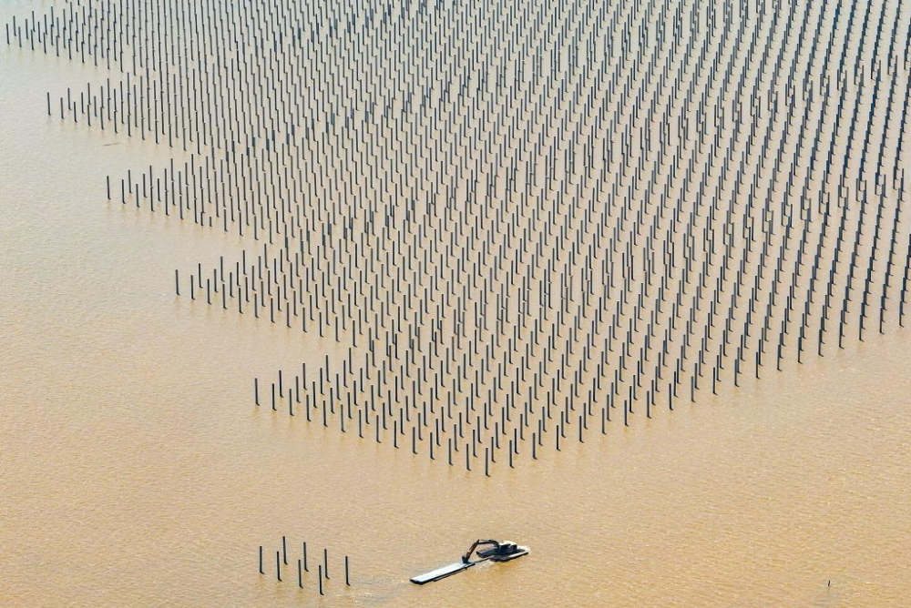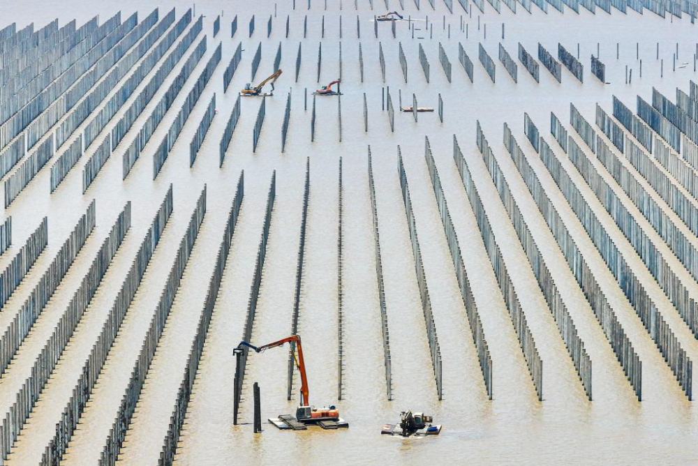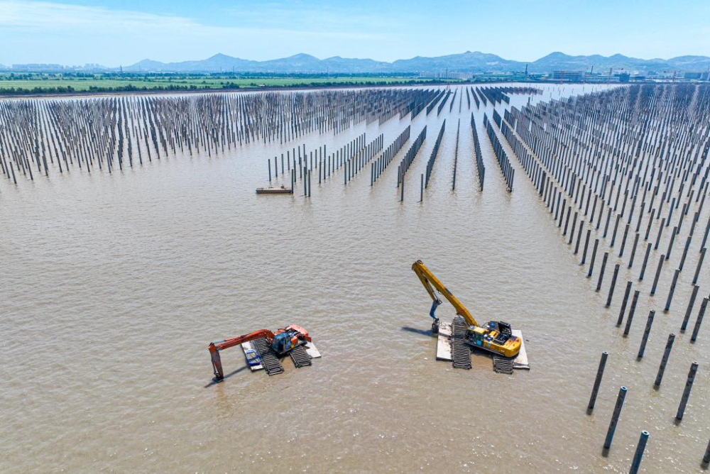 温岭东部松门渔光互补光伏电站是浙江省重点建设项目,项目投资12亿元,在滩涂上方架设光伏组件发电,同时利用滩涂进行水产养殖,形成“上可发电、下可养殖”的渔业发展新路径。目前,施工人员在进行管桩吊运、滩涂拖桩、定位打桩等工序,项目施工稳步推进。新华社发(徐伟杰摄)