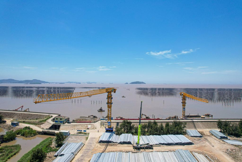 7月6日,在浙江省温岭市东部松门滩涂光伏电站项目建设现场,施工机械进行管桩吊运作业(无人机照片)。