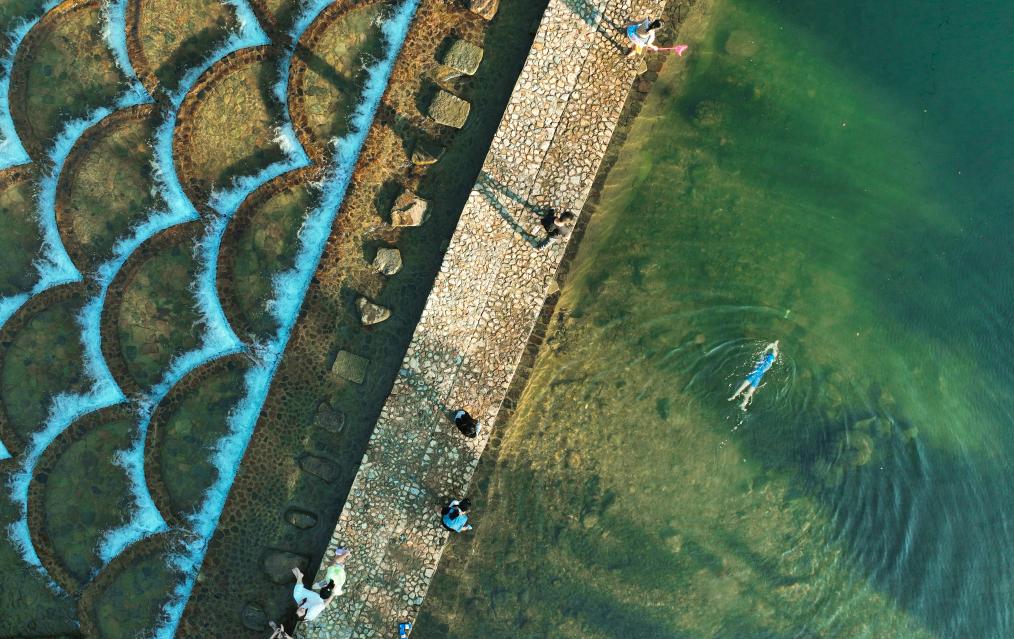 7月11日,人们在杭州临安高虹镇的龙鳞坝戏水(无人机照片)。新华社记者 翁忻旸 摄
