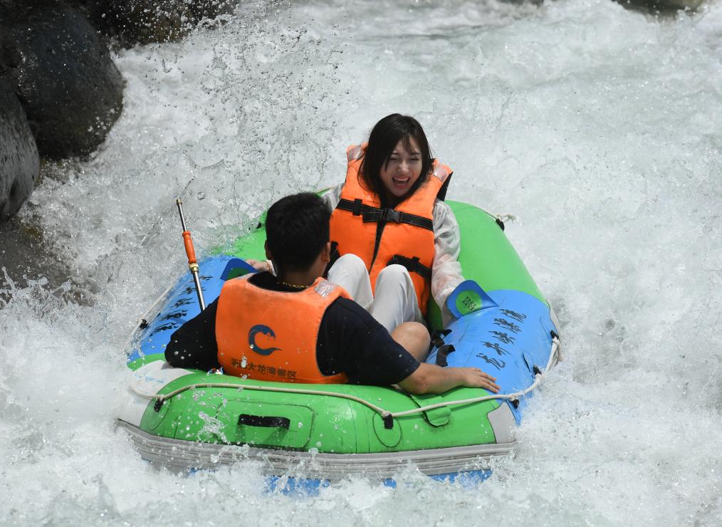 7月11日,人们在杭州临安龙岗镇浙西大龙湾体验峡谷漂流。新华社记者 翁忻旸 摄pagebreak