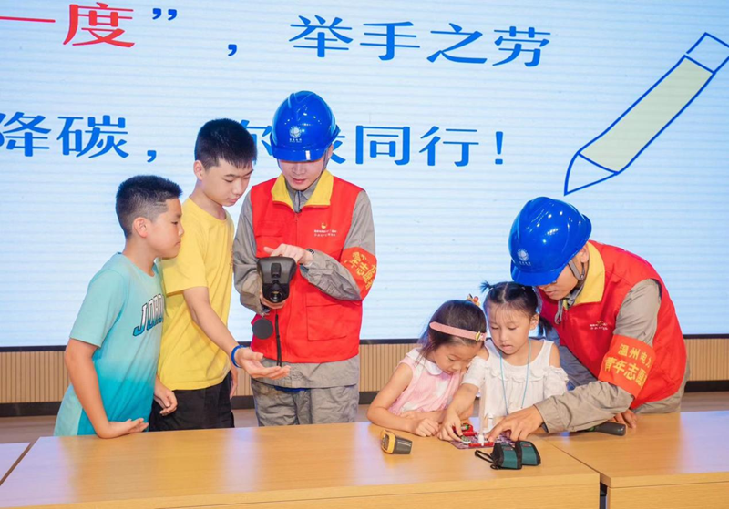 在温州高铁新城实验学校暑期托管班,国网瓯海供电分公司青年志愿者正带领学生们了解电的发展历史。据悉,为解决双职工家庭的“后顾之忧”,温州高铁新城实验学校在今年开设了第一期暑期托管班。现场,青年志愿者们带领学生们体验红外测温仪、测距仪等常用仪器,并讲解其用途和使用方法。同时,分公司纪委坚持监督与服务同向发力,深入一线精准督查,为电力科普护航。(刘佳慧 戴佳佳/文 国网瓯海供电分公司/供图)