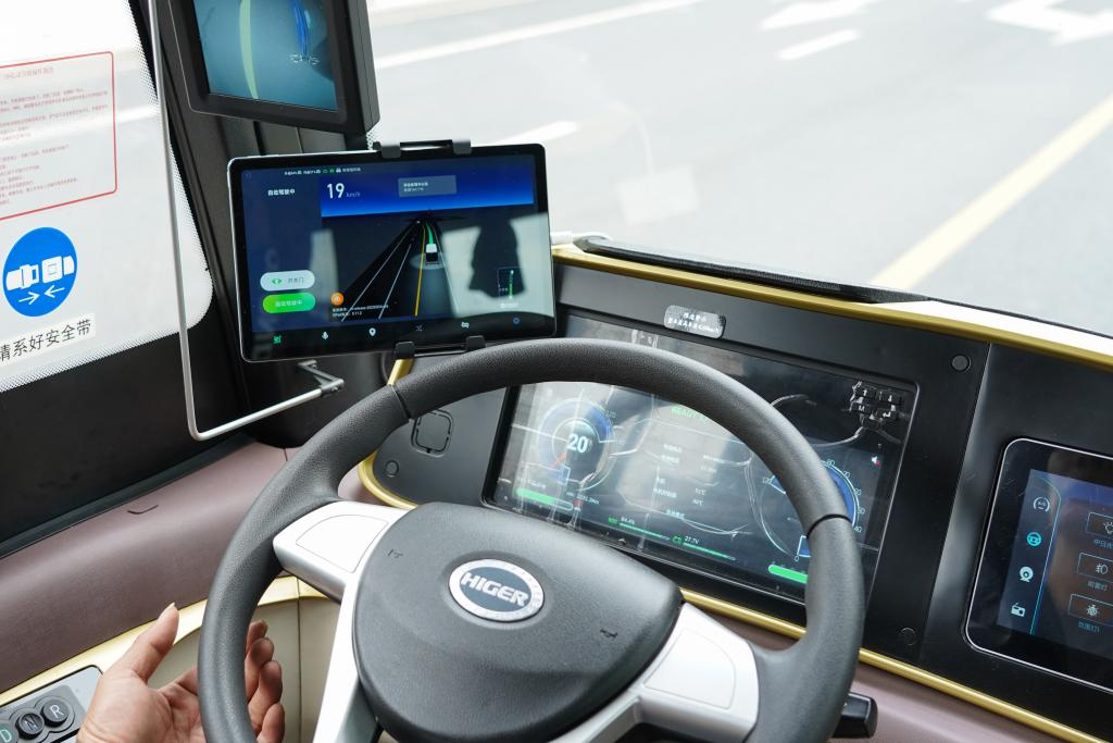 坐上车,车内温度清凉舒适,各类设施齐全,一块长方形屏幕实时显示出当前的行车路线。安全员坐在驾驶位,以便监察车辆自动驾驶的情况。巴士以不超过50公里的时速平稳行驶在路上,遇到车辆超车并线和红灯时,会灵敏感知并缓缓停下。