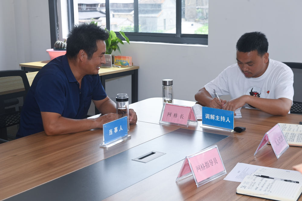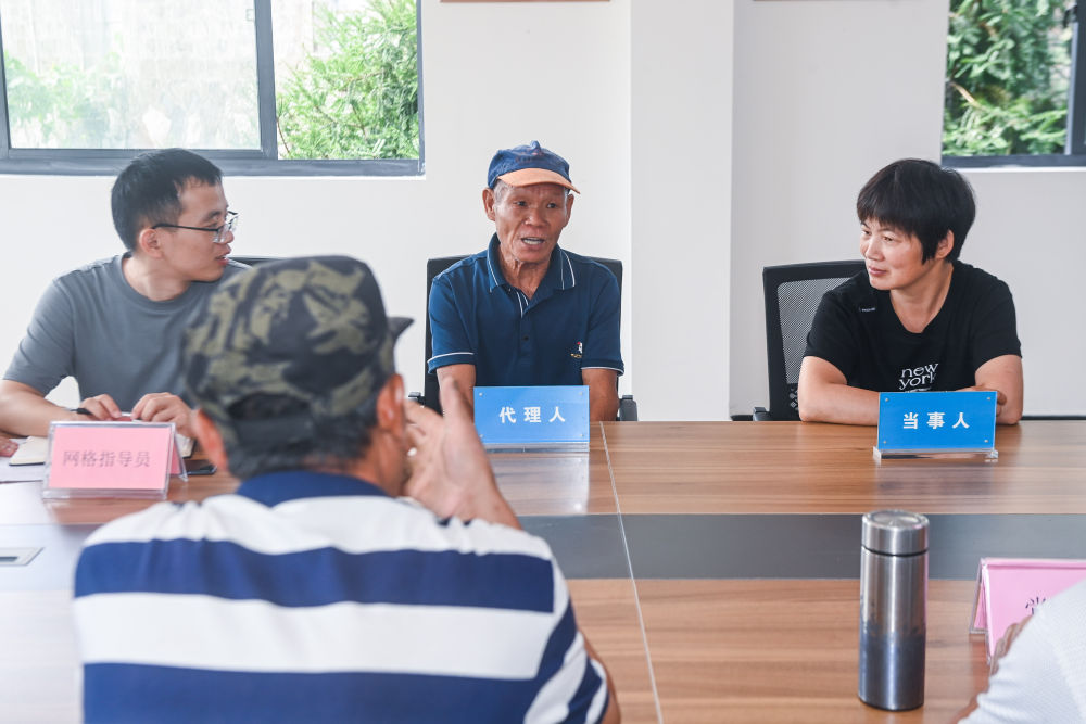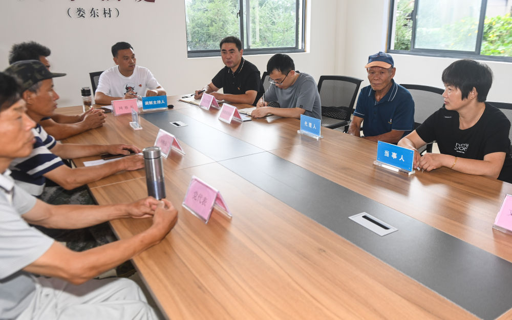 7月26日,在东白湖镇娄东村新时代文明实践站的文明共富会客厅内,网格长召集村里矛盾双方当事人以及党员代表、乡贤代表、人大代表等成员进行宅基地指标纠纷的现场调解。新华社记者 徐昱 摄