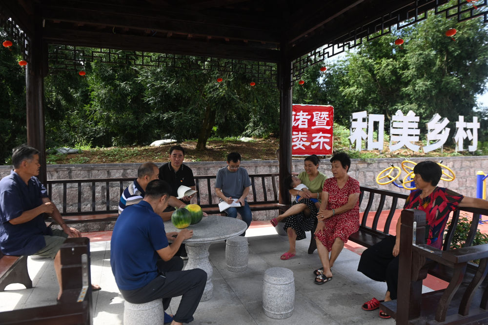 7月26日,东白湖镇、村干部与娄东村村民们在家风家训宣讲亭开展民主恳谈,交流民生实事项目并征询村民意见建议,该宣讲亭也是文明会客厅。新华社记者 徐昱 摄