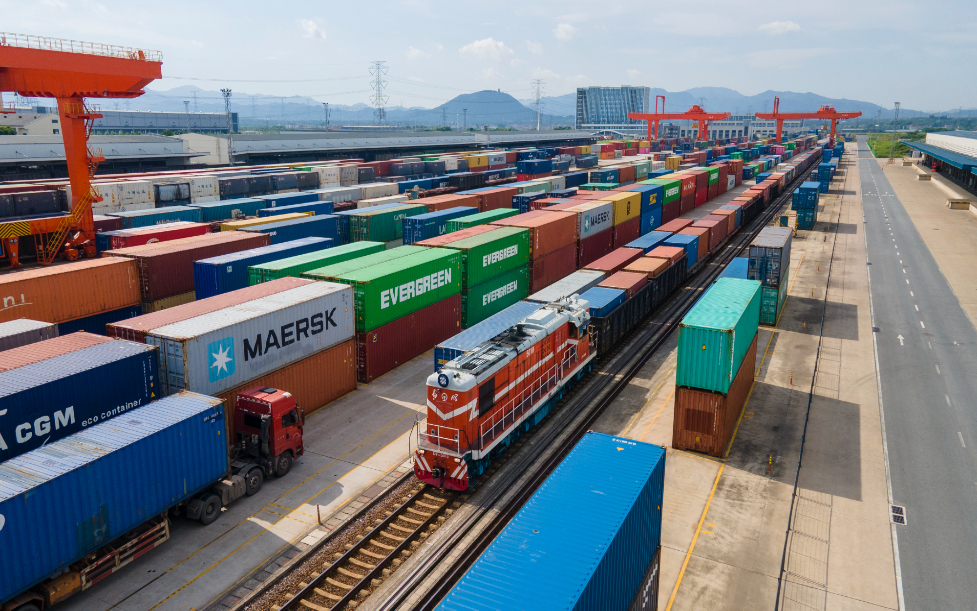 7月25日,在浙江省金华市华东国际联运港,一辆“义新欧”中欧班列在海关监管下,装载着110个标箱日用百货、家用电器、家装材料等货物,启程驶向哈萨克斯坦。新华网发 胡肖飞 摄