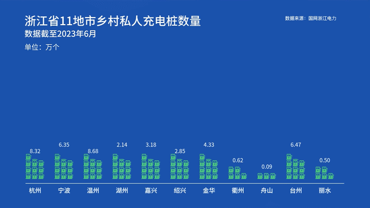 统计数据显示,温州市、杭州市、台州市、宁波市、金华市五个地区乡村私人充电桩数量超过34.1万个,全省占比78.5%。杭州市平均每个村的私人充电桩数量最多。从运行情况看,杭州市、温州市乡村私人活跃充电桩数量较多,分别为73051个和71905个。