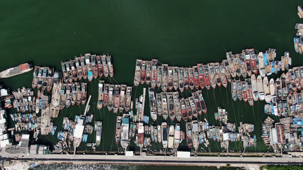 7月27日,广东省潮州市饶平县三百门渔港里回港避风的渔船(无人机照片)。 新华社记者 王瑞平 摄