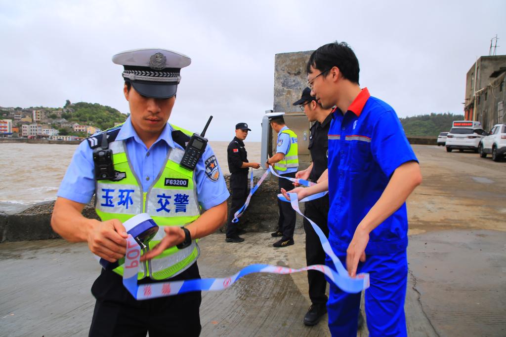 7月27日,民警、交警在浙江省玉环市应东码头设置警戒线。 新华社发 段俊利 摄