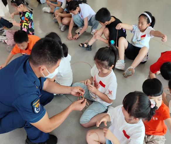 在“‘暑’你最棒·乐学成长”爱心托班课上,龙港市消防救援大队队员们带领孩子们开展了体能训练和消防逃生知识培训,孩子们跟着消防队员的动作练习打“逃生结”,结伴研究消防逃生方法等,在活动中孩子们提升了消防安全意识。