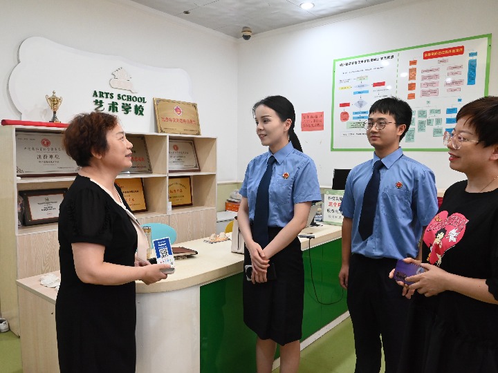 桐庐县人民检察院干警和当地职能部门到县城一家综合培训机构开展整改“回头看”,向机构和现场家长宣讲预收费监管专户相关知识。(吕婉璐 摄)