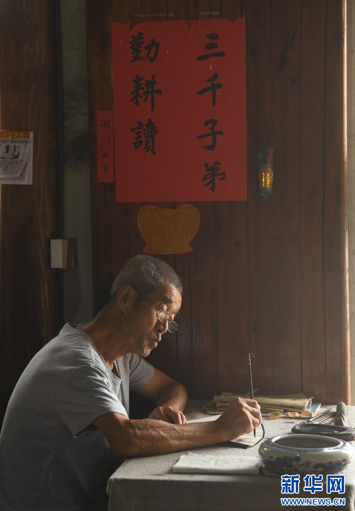 8月1日,诸葛村一名村民在家中写扇面。 新华社记者 翁忻旸 摄pagebreak