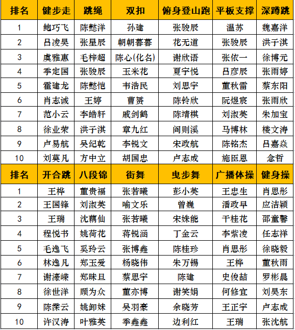 据了解,经过1个月的激烈角逐,12项线上赛事共有近1200名参赛运动员获得奖品,其中各单项前30名的参赛运动员可获得“健身王者”证书,各单项前10名的参赛运动员可赢得“国服”一件。