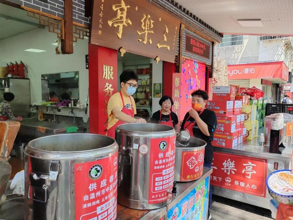暑期,温州三乐亭的义工们坚持每天凌晨三点开始煮茶,在伏茶点供应伏茶直至晚上六点。新华网发 温州市文明办供图