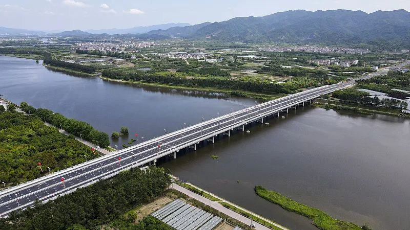 2021年4月26日,浙江省金华市金东区全长659米、双向六车道的东华大桥建成通车(无人机照片)。(图片来源:视觉中国)