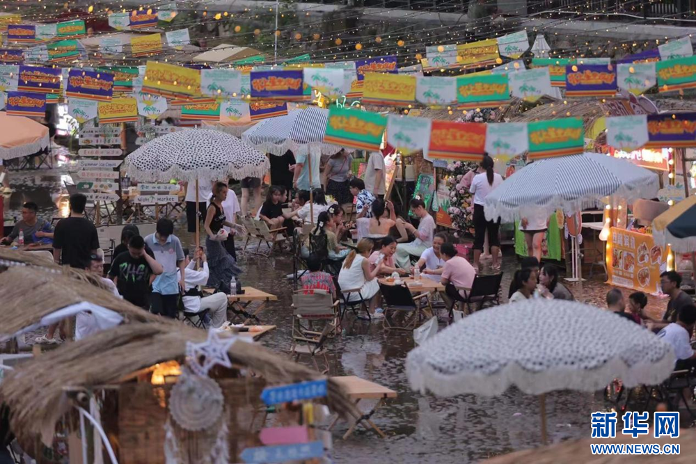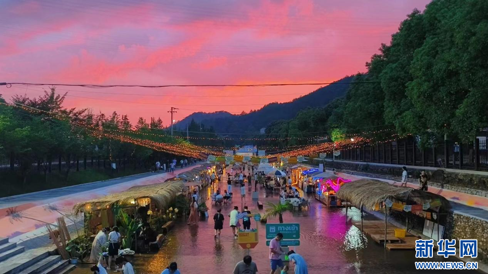 义乌市大陈镇上坑仁村推出“水韵上坑仁”项目。水中吃火锅、溪里玩麻将……趟着八都溪清凉的溪水,一个集美食美景的热带风情星光夜肆成为今夏义乌市民与游客争相打卡的热门地。