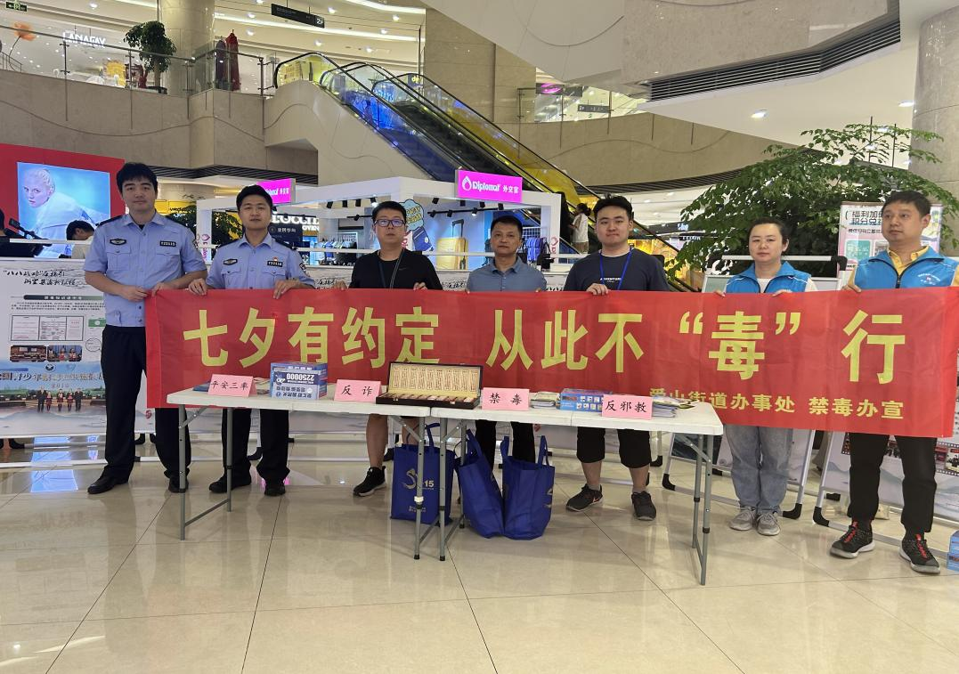 近日,浙江省湖州市吴兴区爱山街道禁毒办联合社会治理办、爱山派出所等在浙北购物中心开展“七夕有约定,从此不‘毒行’”禁毒宣传进商场活动。