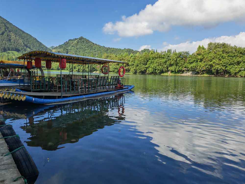 岸边戏水的娃娃们,用脚底板感受着水草的抚摸。游客或溪边散步,或水上泛舟,与山水构成一幅恬静悠然的和美画卷。