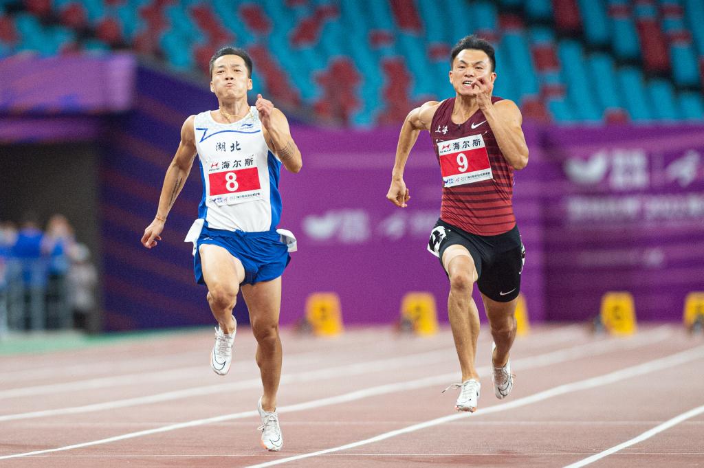 2021年7月9日,湖北队选手吴智强(左)与上海队选手许周政在男子100米决赛中冲刺,他们以10秒18和10秒25的成绩分获第一、二名。当日,为期3天的“韵味杭州”2021田径邀请赛在浙江省杭州市奥体中心体育场开赛。新华社记者江汉摄