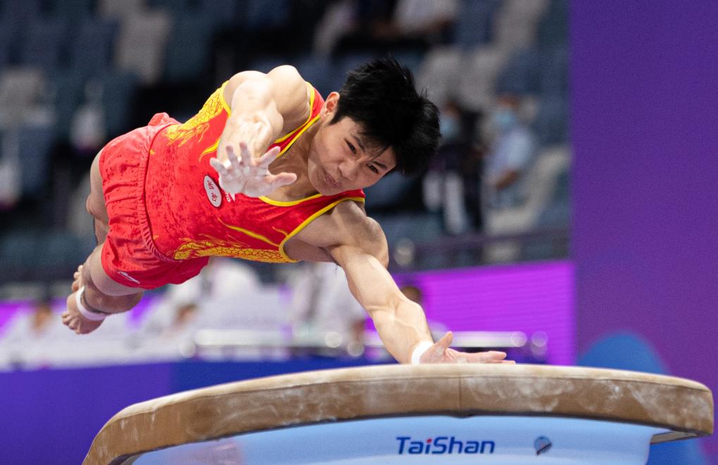 2022年9月9日,刘洋在比赛中。当日,在浙江杭州举行的“韵味杭州”2022年全国体操锦标赛男子跳马决赛中,浙江特美赢杯队选手陈忆路获得冠军,湖南队选手刘洋获得亚军,广东队选手陈志毅获得季军。新华社记者江汉摄