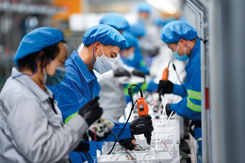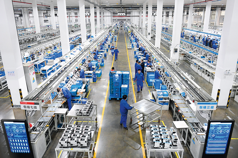 在位于浙江省台州市的杰克科技股份有限公司,工作人员在装配车间装配缝纫机(2023年3月23日摄) 翁忻旸 摄