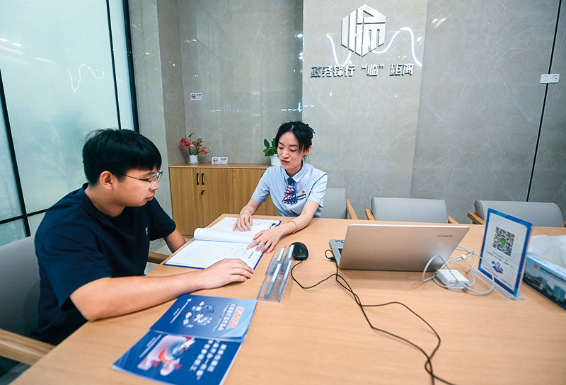 在杭州市临安区政务服务中心的“为企服务中心”,党员志愿者(右)解答企业主的疑问(2023年7月7日摄) 徐昱 摄