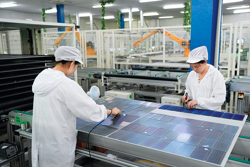 在浙江省台州市黄岩区省级专精特新“小巨人”企业浙江公元新能源科技股份有限公司,工作人员生产太阳能电池组(2023年8月9日摄) 翁忻旸 摄