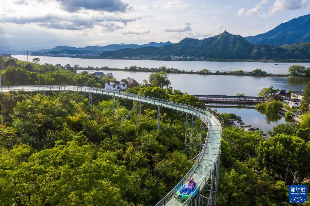8月19日,游客在三都渔村体验星空水滑道特色项目(无人机照片)。