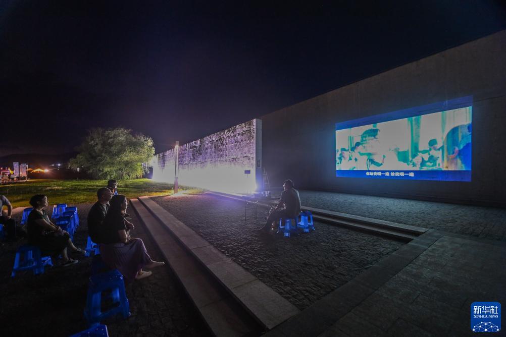 8月19日,游客在三都渔村观看露天电影。